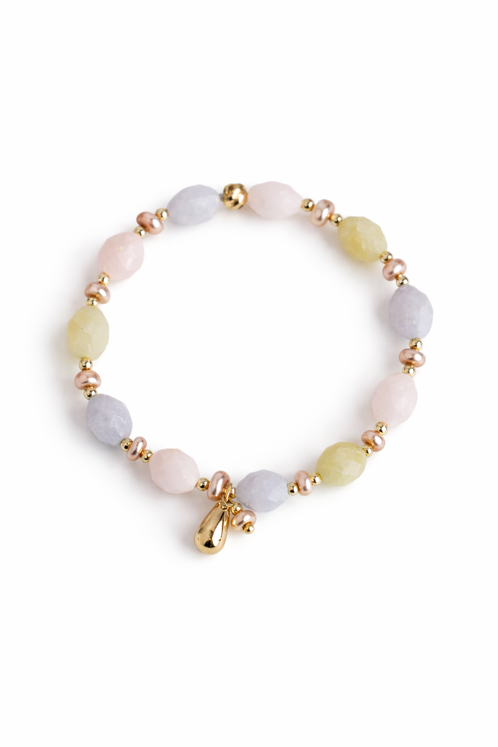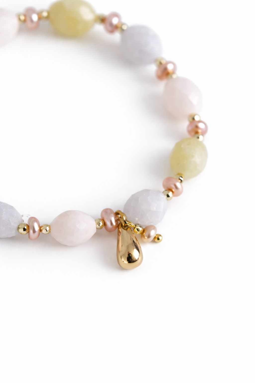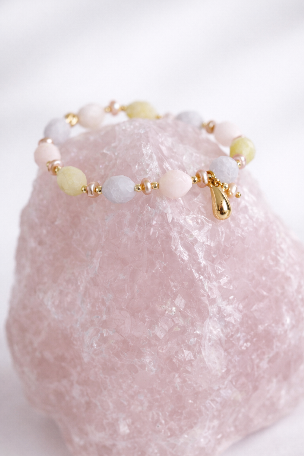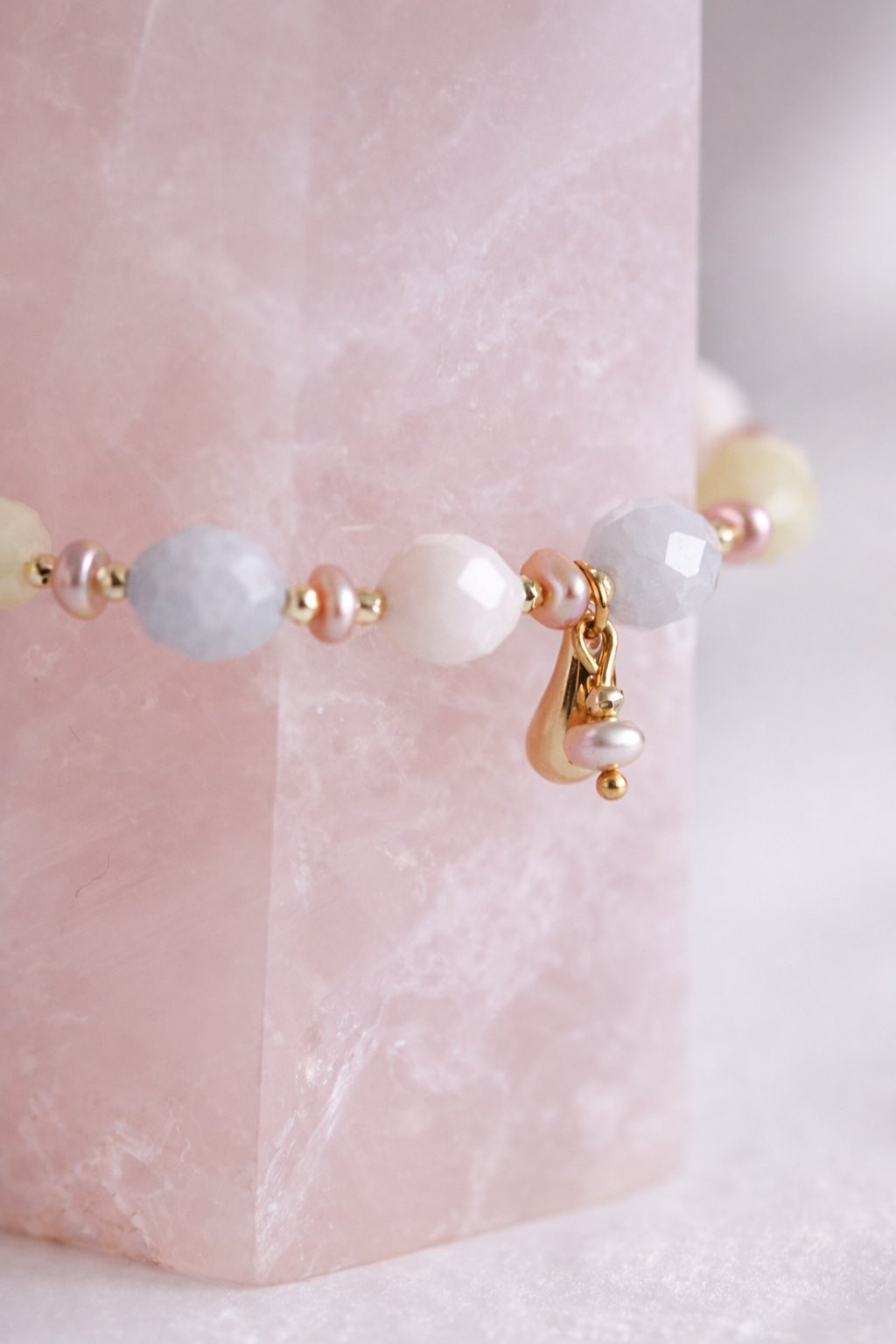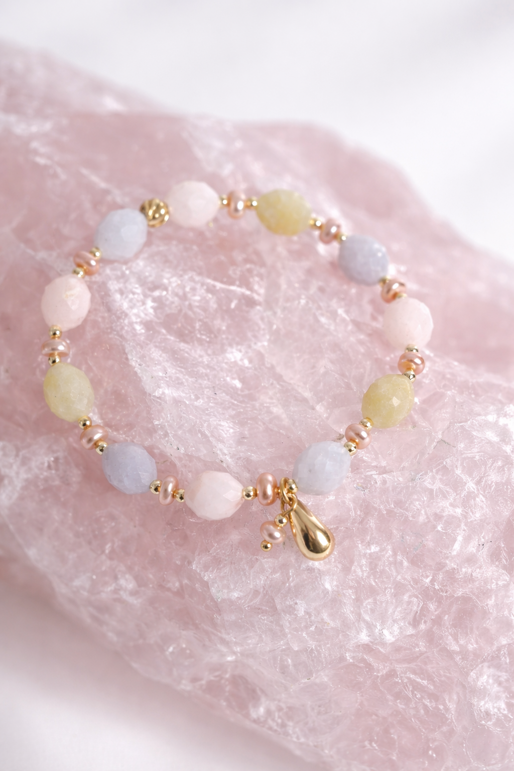 Esencja Kobiecości – bransoletka z fasetowanego morganitu, różowych pereł i zawieszką perełka & kropla