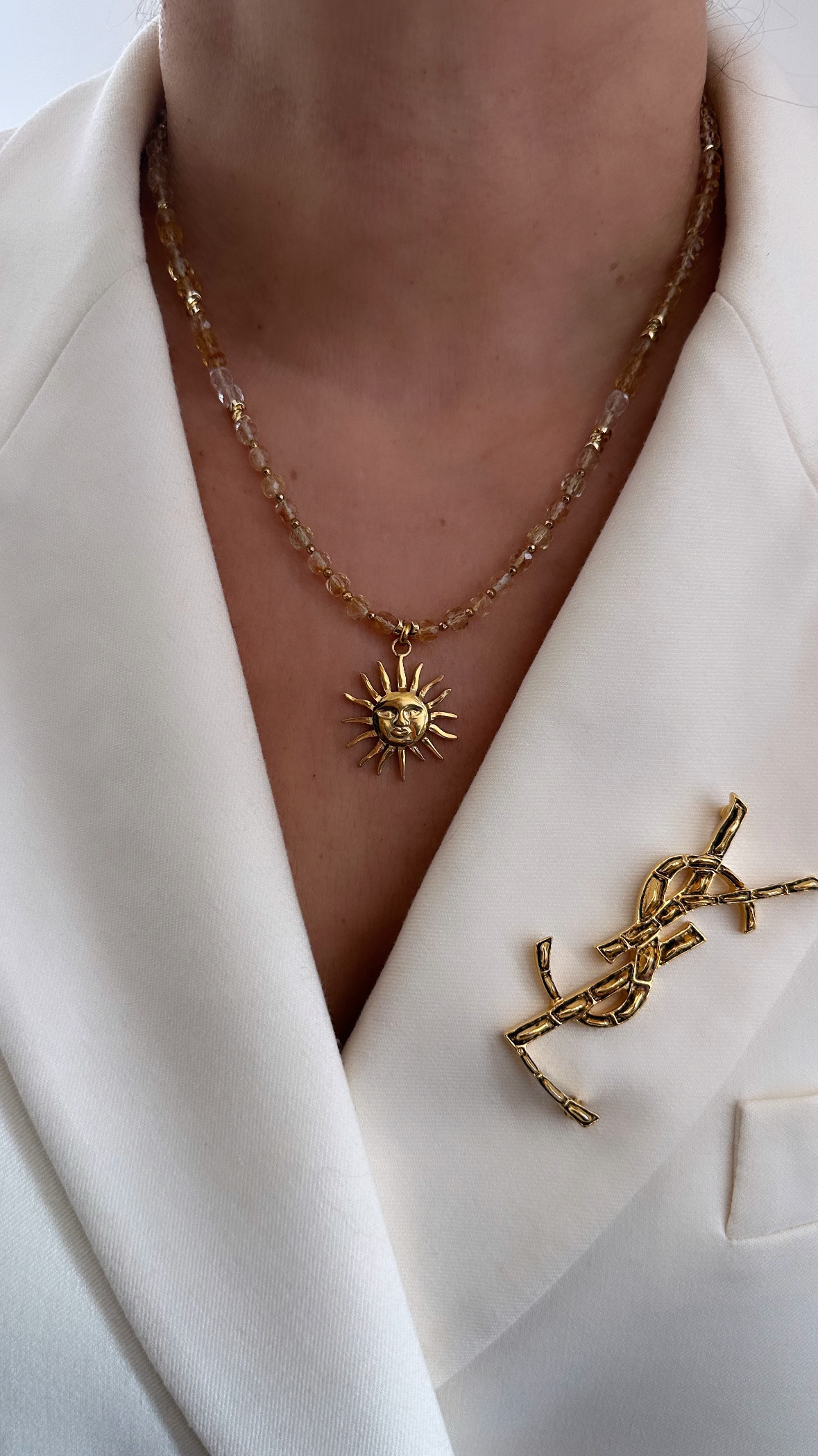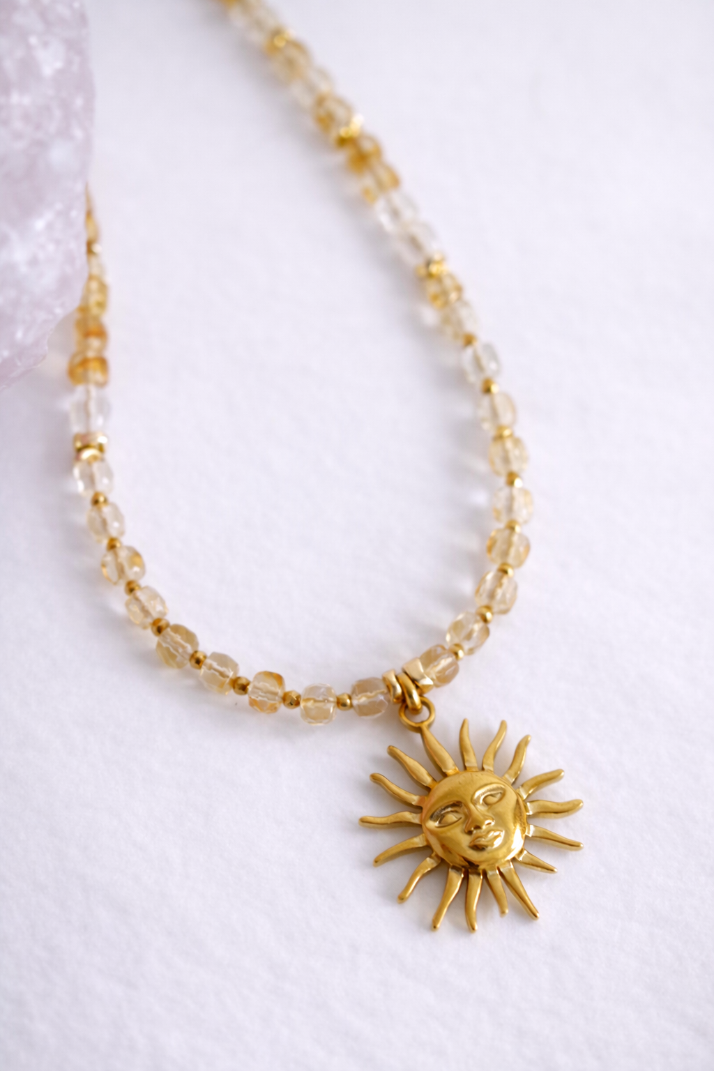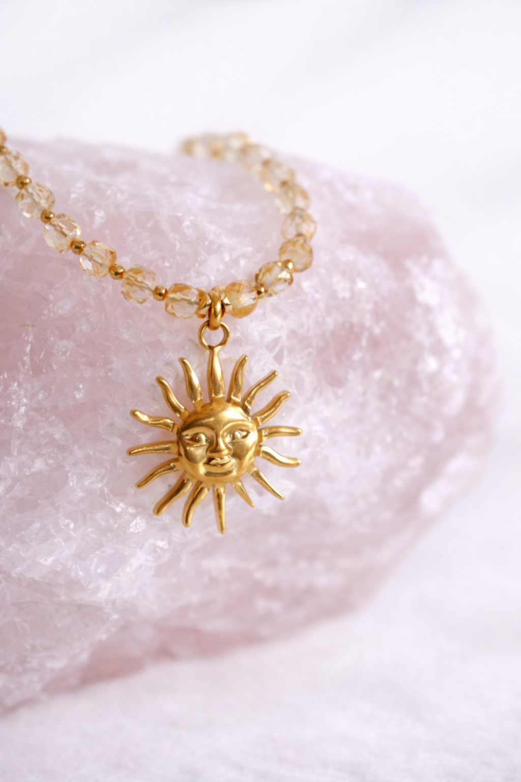 Centralnym punktem naszyjnika jest zawieszka w kształcie słońca, symbolizująca energię, siłę wewnętrzną i obfitość. Połączenie złocistych odcieni cytrynu z promiennym symbolem słońca sprawia, że naszyjnik nie tylko pięknie zdobi, ale działa jak talizman przyciągający szczęście, sukces i pozytywne wibracje.