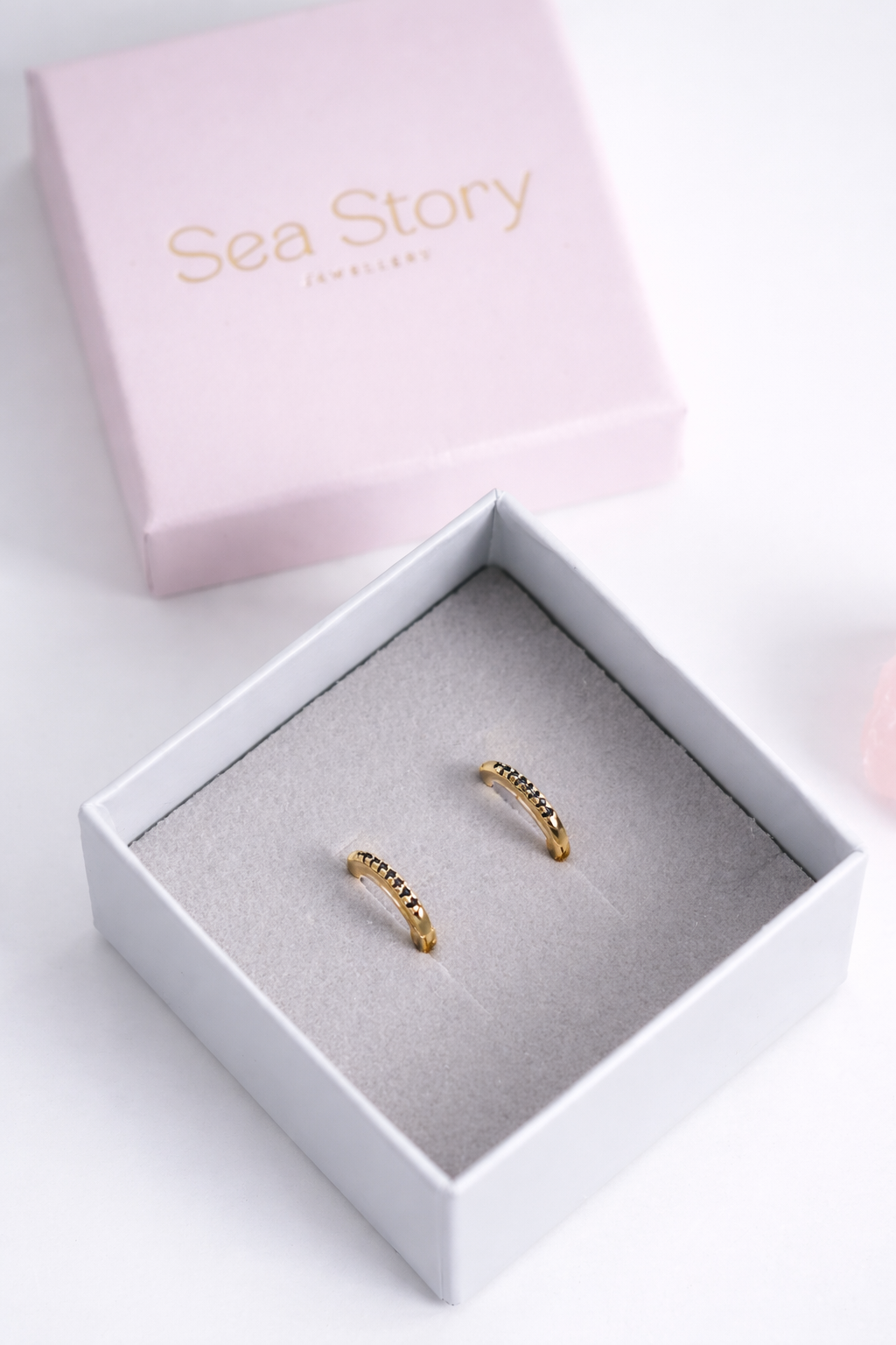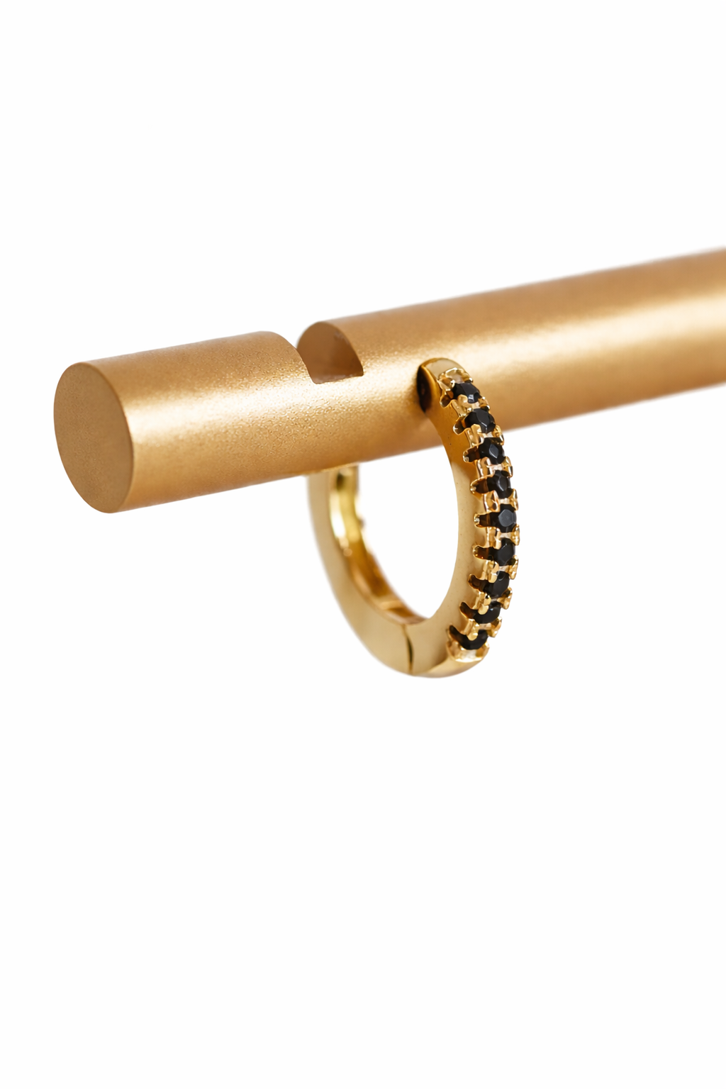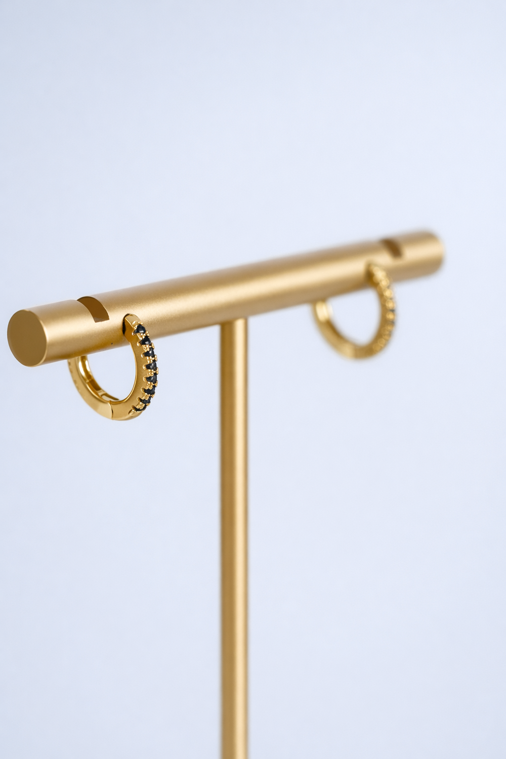 Minimalistyczne, a zarazem niezwykle efektowne – kolczyki Nocny Blask to idealne połączenie klasyki i nowoczesnej elegancji. Małe kółka zostały ozdobione czarnymi cyrkoniami, które subtelnie połyskują przy każdym ruchu, nadając stylizacji wyrafinowanego, lekko tajemniczego charakteru.