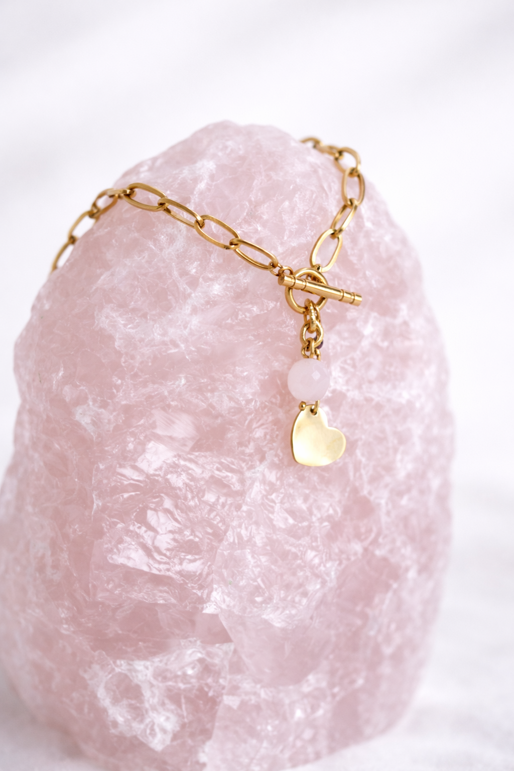 Poczuj moc miłości zamkniętą w eleganckiej biżuterii. Sercem w Miłości to wyjątkowy naszyjnik z łańcucha ogniw i zapięciem toggle, ozdobiony granatem i kwarcem różowym – kamieniami, które symbolizują namiętność, uczucia i harmonię w relacjach.
